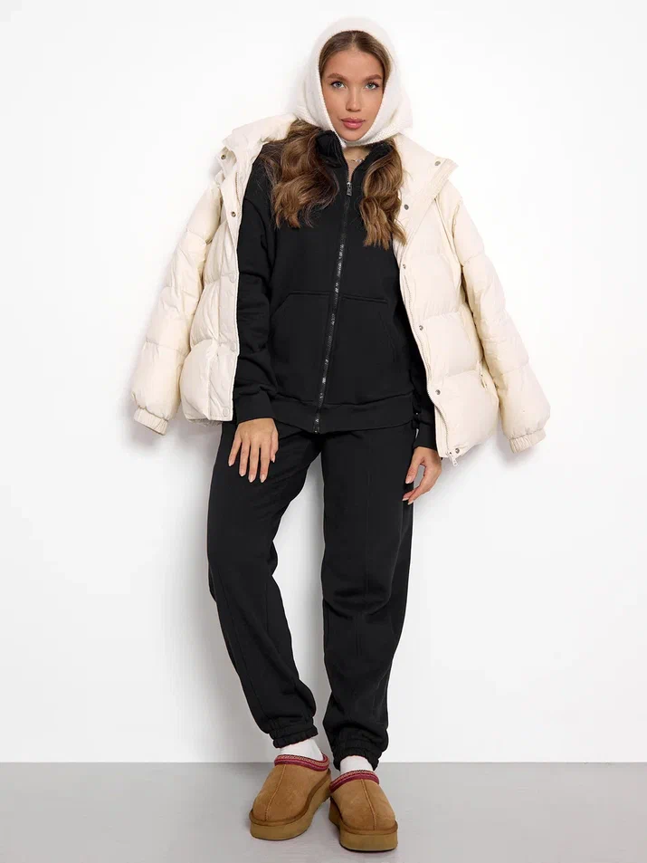 Кофта оверсайз на молнии с воротником и джоггеры со стрелками создают аккуратный образ в стиле спорт-шик. Высокая посадка подчёркивает талию, мягкая резинка не давит, боковые карманы удобны. Манжеты на рукавах помогают сохранить тепло и комфорт при носке.